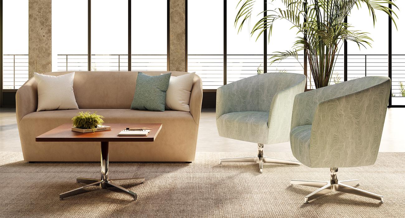 With a generous 24” seat width and a very small footprint, Swerve lounge seating blends contemporary minimalist styling, sleek tailoring and luxurious comfort. Each Swerve frame is fabricated, only as needed, using a pioneering and innovative flat panel construction technique…ecologically friendly and greatly reducing inventory and manufacturing costs. Standard base selections include a self-return swivel, black dual wheel casters, and round legs.